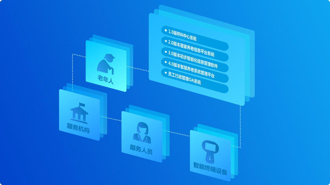 提供养老信息平台系统1.0版呼叫中心系统、2.0版本居家养老信息平台系统、3.0版本初步智能化信息管理软件、4.0版本智慧养老系统管理平台、员工行政管理OA系统、商品管理系统、客户管理系统、工单管理系统、智能设备远程监控管理系统等的智慧养老系统管理软件运营。